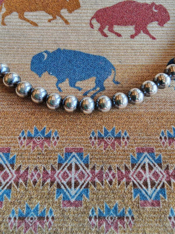 This is a 6mm sterling silver Oxybead strand that’s 16″ long. These are machine made Pearls and very round. I have these shown stacked with a longer strand that’s got a Royston Turquoise pendant on it. These look great in a stack or wearing alone!