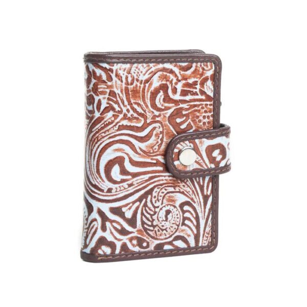 THIS EMBOSSED LEATHER BEAUTY FEATURES AN INTRICATE FLORAL DESIGN IN RICH BROWN TONES. IN ADDITION TO STANDARD SLOTS, THE INNER METAL POP-UP COMPARTMENT OFFERS RFID PROTECTION FOR YOUR CARDS, BLENDING SECURITY WITH STYLE. COMPACT YET LUXURIOUS, IT’S THE PERFECT ACCESSORY FOR THE SOPHISTICATED, SECURITY-CONSCIOUS WOMAN.