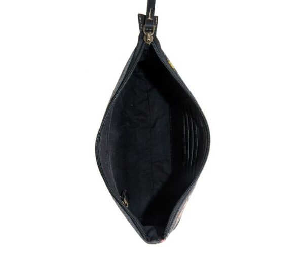 Discover the charming Cavender Floral Canvas Pouch – an adorable clutch crafted from woven canvas and warm caramel leather. The imprinted front panel features a delightful woven-look floral pattern, while the dark denim-look canvas bottom panel continues onto the reverse, showcasing a prominent leather label accent. Uncommonly charming, this beautiful bag is a delight to the eye. The knotted wristlet carrying strap in coal black leather completes the bag.
