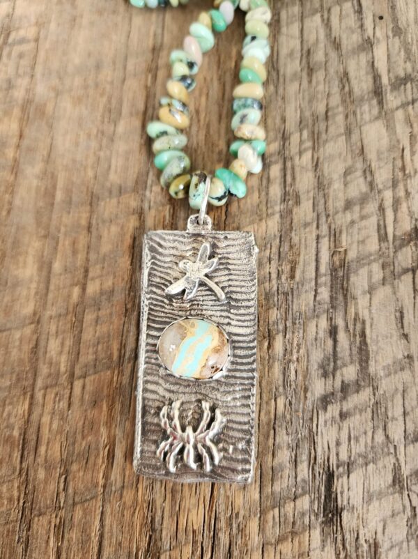 Crafted by Nature’s Hand: Our exquisite pendant, cast using the ancient cuttlefish bone technique, weaves together three enchanting elements. A delicate dragonfly takes flight, its wings etched with intricate patterns. A spider, symbolizing creativity and patience, weaves its web. And at the heart of it all, a Royston Turquoise gemstone—its earthy matrix and vibrant blues reminiscent of desert skies. Whether you seek symbolism or simply crave a wearable work of art, this pendant celebrates the magic of nature.