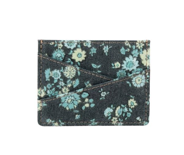This card case offers a distinctive style with its floral print against a woven canvas charcoal denim background. Carry your essential cards and ID in style. Includes an interior compartment for extras like cash.