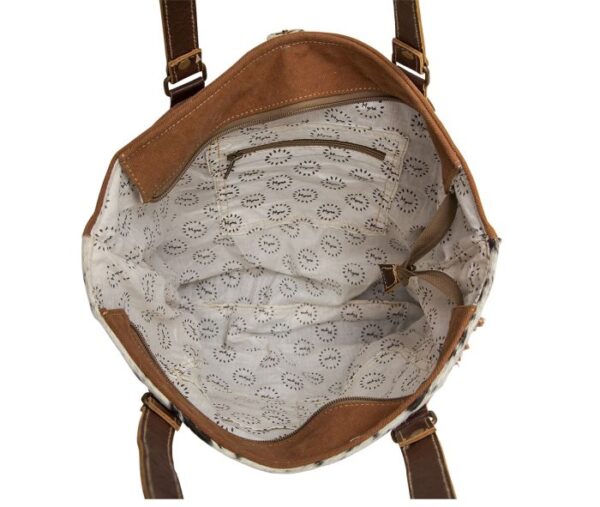 Stay eco-friendly while staying fashionable with the Myra Bag “Hagrid Tote Bag”. Crafted from a blend of canvas, rug, leather, and hairon, this tote bag boasts dimensions of 17.5 inches in width, 4 inches in depth, and 14 inches in height. The 12-inch handle ensures comfortable carrying. Whether you’re heading to work, a weekend getaway, or a shopping spree, the Hagrid Tote Bag combines style and sustainability beautifully.