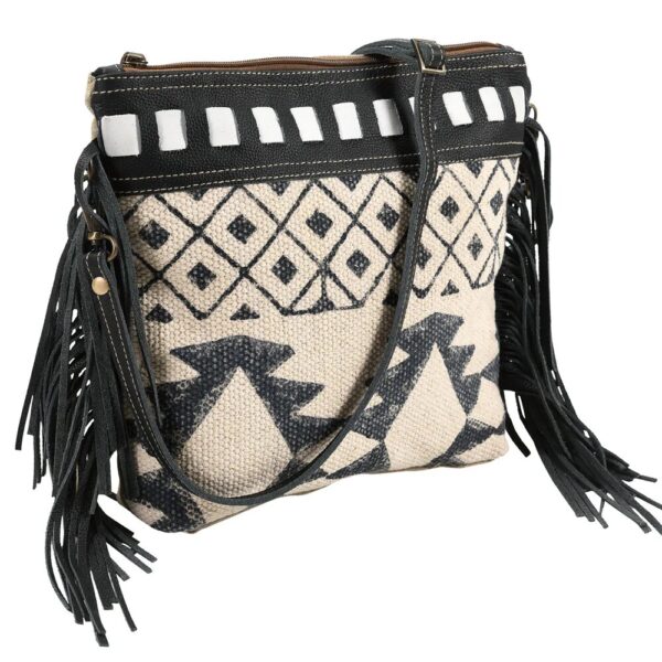 Made with a hand woven wool saddle blanket giving it a western traditional yet trendy and elegant look. Hand-washed vintage print 100% cotton canvas fabric. High quality genuine top grain leather. Soft and supple leather that ages beautifully as it wears. Decorated with beautiful leather fringes giving it a western look. Genuine YKK brand known for long lasting and durable zipper closures ensure security of your essentials. Beautiful, detailed leather braiding.