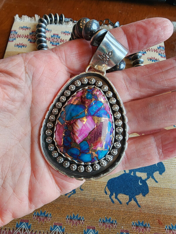 Here is a beautiful Pink Dahlia pendant Dave made using some stone we bought directly from the Kingman Mine Store. Kingman Mine does some sort of magic to make this stone… don’t ask me what it is… and it has Kingman turquoise and maybe some dyed Spiny Oyster? Anyway, no matter because it’s beautiful and makes some really pretty, unique jewelry.