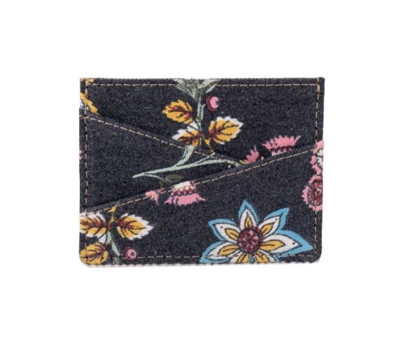 This beautiful card case features a wonderfully delicate array of bright blooms, set against a dark denim woven canvas background. With several slots and an inner compartment, it’s designed to carry your essentials safely.
