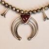 This mini squash blossom necklace? Is all that and more! It has a beautiful Purple Spiny Oyster stone that is triangle shaped and believe me, that’s hard to do! To get the bezel to wrap around that shape is not easy. It has 3 mini squash blossoms on each side and has bench made sterling silver beads. Of course, it’s all sterling silver. It’s a Phil Garcia piece of art. If you love a good squash blossom but can’t have the weight of one hanging on your neck all day, this is your answer! This measures 17.5″ stretched out and hangs about like what a 16″ necklace would hang. Perfect in every way!