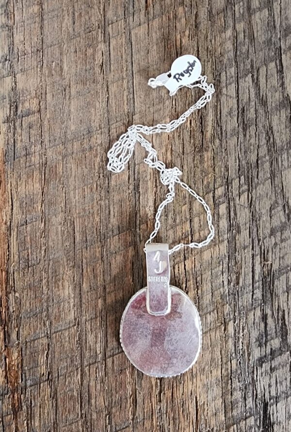 This necklace is made by Dave using Royston turquoise we dug out of this earth in Tonapah, NV, which is the only place in the world it’s found. It is strung on an 18″ sterling silver patterned cable chain with a lobster clasp. It has a simple bezel with beaded wire wrapped around it. Finally, it has an oversized bail with a teepee stamped into it so that you can wear this on a larger chain, strands or your Navajo Pearls! The earthy matrix in this stone adds to the beauty of the greener color. All our turquoise came out of the same mine but there’s such a difference in color, matrix, etc., you can get a wide array of looks!