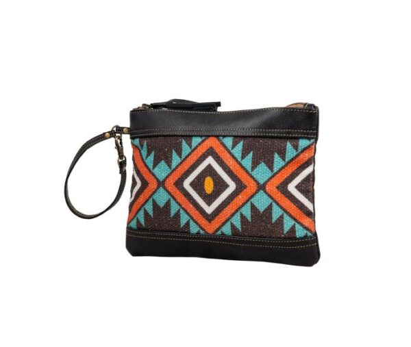 Dynamic, bold use of color makes this wonderful pouch so pleasingly unique! Top and bottom panels of dark chocolate brown leather frame the upcycled woven rug in hues of deep umber, turquoise, and sunset orange. It’s just ‘the right size’ to carry your items on the go. Features a zipper-close top, leather wristlet strap, and woven canvas back.