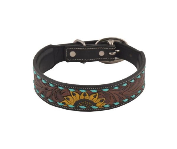 This leather dog collar is size medium and measures 20″ laid out flat. It is 1.5″ wide and has padding on the area that goes against your dog’s neck for added comfort. Very pretty and very durable.