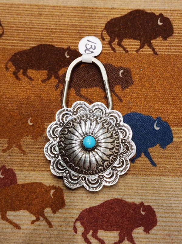 Oh man, this stamped sterling silver and (I believe) Kingman turquoise keychain is so so pretty! It has a clasp in the back that’s super secure so it won’t come open and have your keys fall off. Just a really nice, pretty keychain.