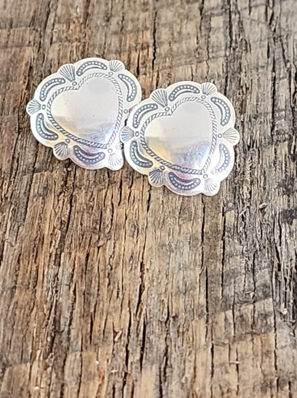 These sweet earrings are shaped like a heart and have beautiful stamping along the edges. They measure 1/2″ and are super cute!