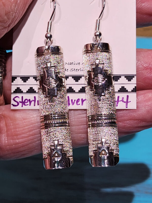 Oh my gosh! If you’re looking for something simple yet beautiful, here you go! This pair of dangle earrings is a great way to set off any other jewelry you have on. They’re sterling silver on a sterling silver french hooks and they’re stamped with a southwestern look. They are not heavy at all so all day wear is easy peasy. They have a drop of 2 1/4″ from top to bottom.