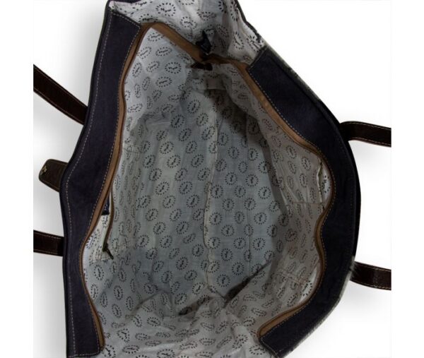 This beautiful bag features the signature upcycled woven rug from the Sun Serape collection with a striking tribal-inspired pattern. The great colors are matched perfectly with special accents of hairon hide and rich chocolate leather. The back and sides are durable charcoal woven canvas with a frayed-edge treatment. Extra zippered pocket on the back adds convenience. The roomy interior features a zippered pocket and zipper-close top. Matching durable leather carrying handles.