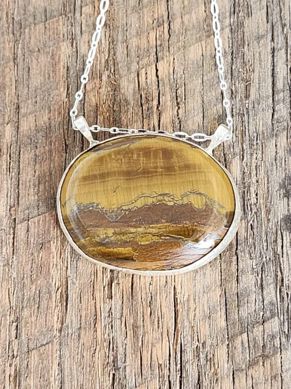 This Tiger’s Eye necklace is made by Dave using Tiger’s Eye that my uncle found years ago and gave to Dave to work his magic. It’s set in sterling silver simple bezel and has 2 bails for a balanced and lovely hang. The chain is a split patterned cable chain, 18″ and has a lobster clasp. Most Tiger’s Eye is cut so that it looks like an elongated pupil but Dave cuts his the other way so it looks like mountains! Very striking and beautiful!