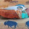 Here is a beautiful pocketknife with turquoise and orange spiny oyster inlaid into the handle. It has a clip on the back so you can easily clip it to your pocket. This is 3 1/2″ long, folded up and is 6 1/4″ long folded out. This is perfect for carrying in your pocket, putting in your car or carrying in your bag. This comes in a storage box.