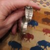 Here’s a really nice, smaller sized bracelet that has stamped and overlay work throughout. It is not marked but for “sterling” but it is old so that’s probably why its not marked. It measures 6 3/4″ all the way around, including the gap. A really nice, lightweight bracelet that won’t feel like you’re carrying around a cinder block on your wrist. Has a little bit of flex for adjustment.