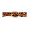 This leather dog collar is size small and measures 17″ laid out flat. It is 1.5″ wide and has padding on the area that goes against your dog’s neck for added comfort. Very pretty and very durable.
